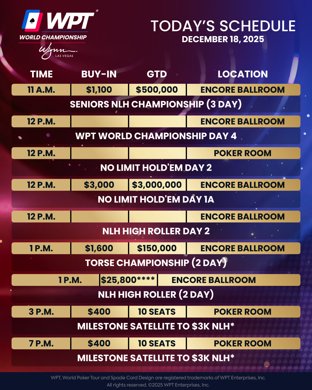 Além disso, um $1,100 Satélite Milestone para o $10K Seniors High Roller atraiu 93 As inscrições oferecerão nove vagas e um prêmio de $400 Satélite Milestone para o $3K NLH 6-Max está atualmente em andamento com 42 entradas atuais e um 10-Garantia de vaga. As inscrições e reentradas permanecerão abertas até o início do nível. 9.